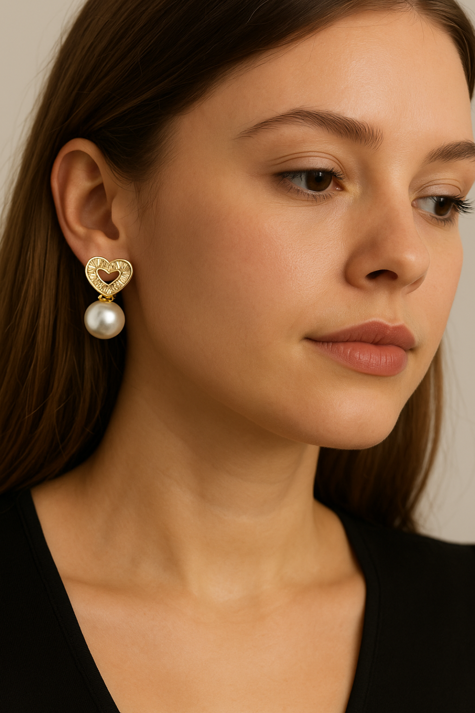 Made from 18K gold-plated stainless steel, these earrings ensure lasting shine and durability, while being gentle on sensitive skin. The lightweight design provides comfort without compromising style, making them an ideal accessory for any wardrobe. Whether paired with casual or formal outfits, the Heart Pearl Drop Earrings offer a classic statement of grace and elegance.
